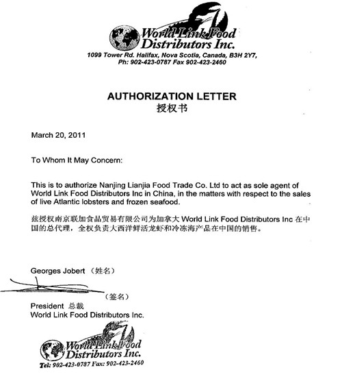 南京联加食品贸易有限公司成立于 2011 年。公司长期关注国人膳食结构及消费趋势,与欧美等国家建立长期合作关系,搭建国际海鲜贸易枢纽及销售网络,已获加拿大 World Link Food Distributors Inc 授权,为中国区域总代理,负责大西洋鲜活龙虾和冷冻海产品在中国的销售业务。公司秉承 “绿色、锁鲜、味享、营养” 的理念,致力于将大鳌虾、面包蟹、黄金蟹、冻海参等优质海鲜,及时提供给广大客户。 World Link授权书: